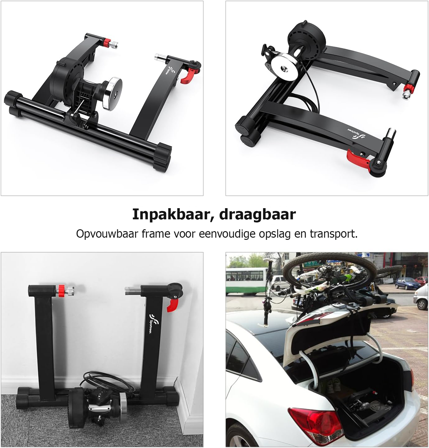 Het stevige stalen frame is inklapbaar, waardoor je de trainer makkelijk kunt opbergen of meenemen. Dit maakt het ook praktisch voor mensen met beperkte ruimte of wie de trainer bijvoorbeeld mee wil nemen naar een andere locatie.
